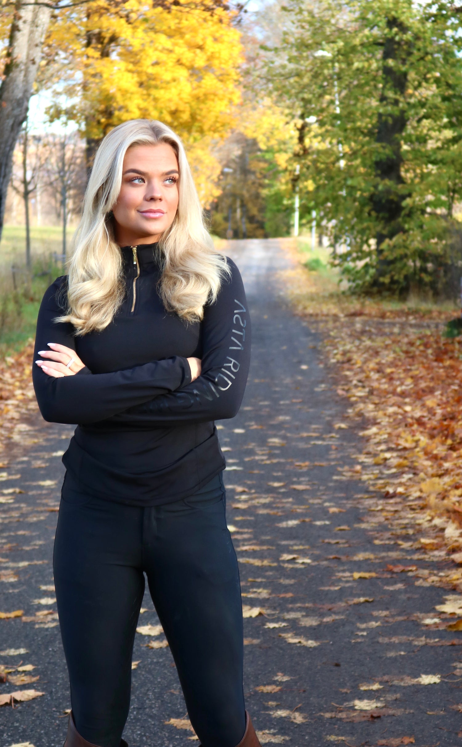 Modellen på bilden är 164cm och bär storlek XS i ridtröja och ridbyxor.